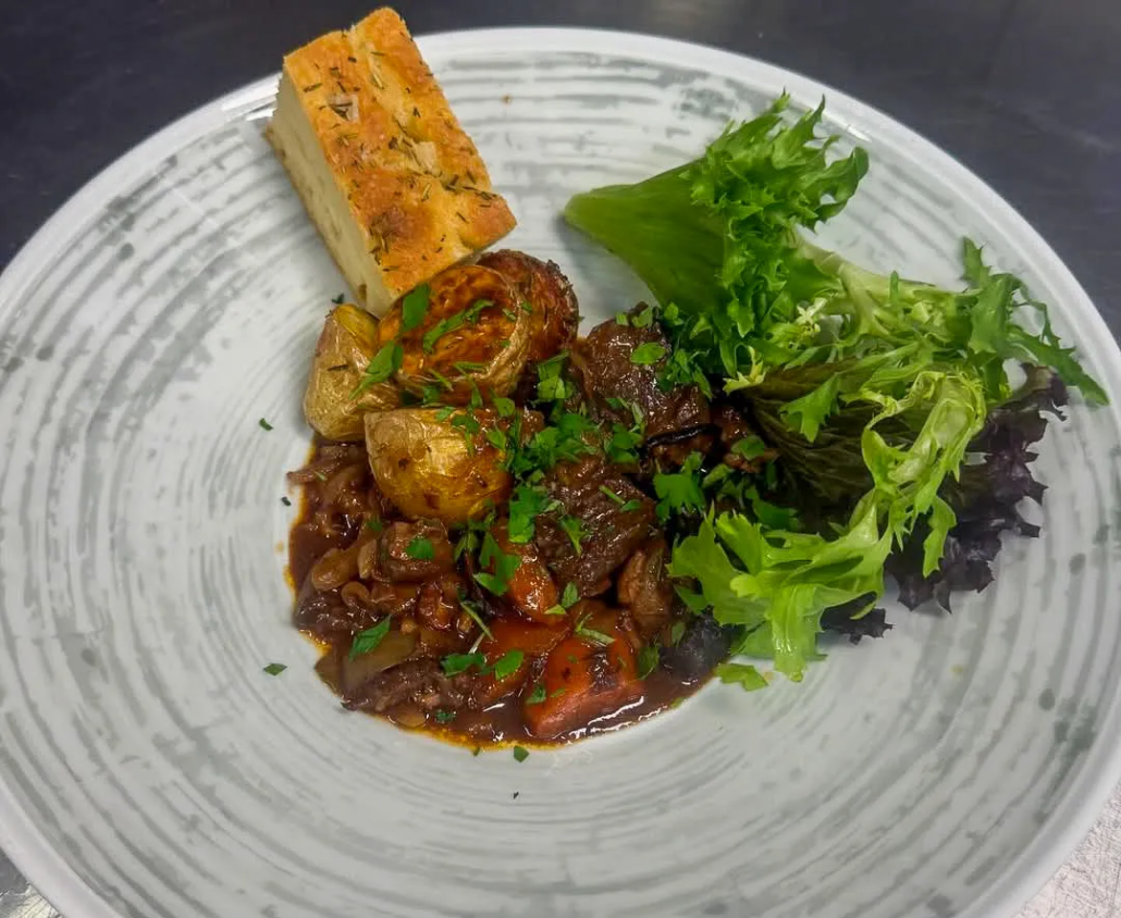 Pannbiff med ölbrässerad lök, potatis, skysås, pressgurka